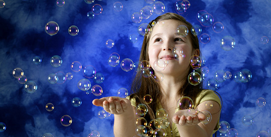 Un enfant aussi créé des bulles en grand nombre, mais il ne s’enferme pas à l’intérieur ; il les laisse partir, s’envoler et éclater. Voilà ce qui l’amuse et l’émerveille !